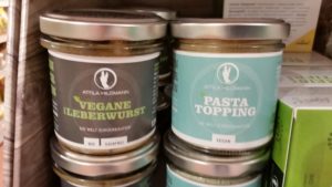 Hier seht Ihr Beispiele, wie laut Bundeslandwirtschaftsminister Schmidt die Kunden getäuscht werden. Vegane Leberwurst von Attila Hildmann. Wer das Wort vegan nicht kennt, meint womöglich, er erhält „echte“ Leberwurst und selbst durch den Geschmack merkt er nicht, dass er getäuscht wurde. Attila Hildmann hat nämlich einen täuschend echten veganen Brotaufstrich erfunden. Zur Beruhigung aller steht seitlich auch noch drauf: ohne Tier. Trotzdem: solche Verbrauchertäuschungen will der Bundeslandwirtschaftsminister über das Lebensmittelgesetzbuch künftig verbieten. Ihm und der Fleischlobby geht wohl gegen den Strich, dass immer mehr Menschen sich lieber und öfter pflanzlich ernähren.